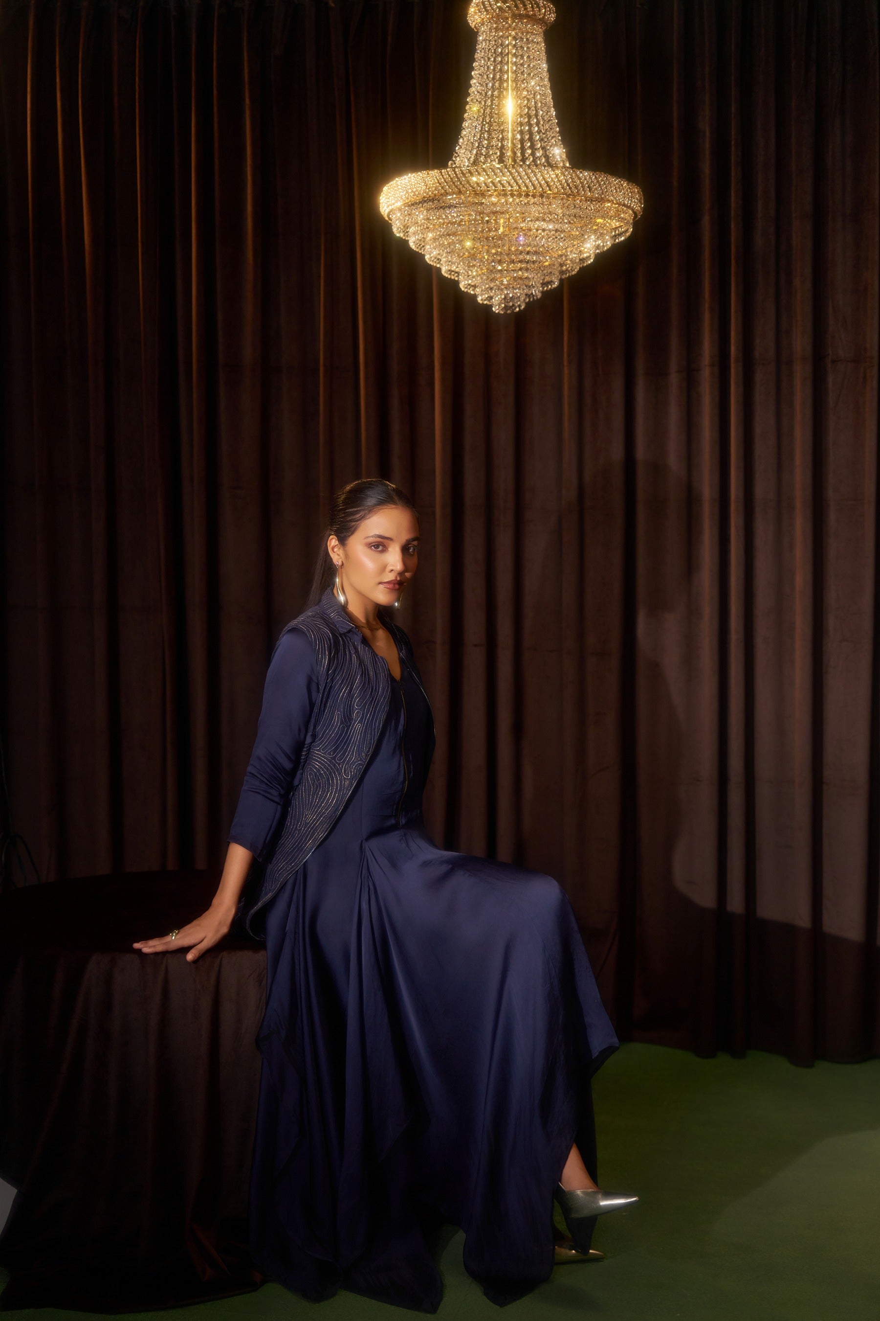 The Elor Sapphire Set combines a jacket in corded embroidery on pure silk organza with a pure organza satin dress. Its jewel-toned blue and tailored fit make it stand out at evening events.