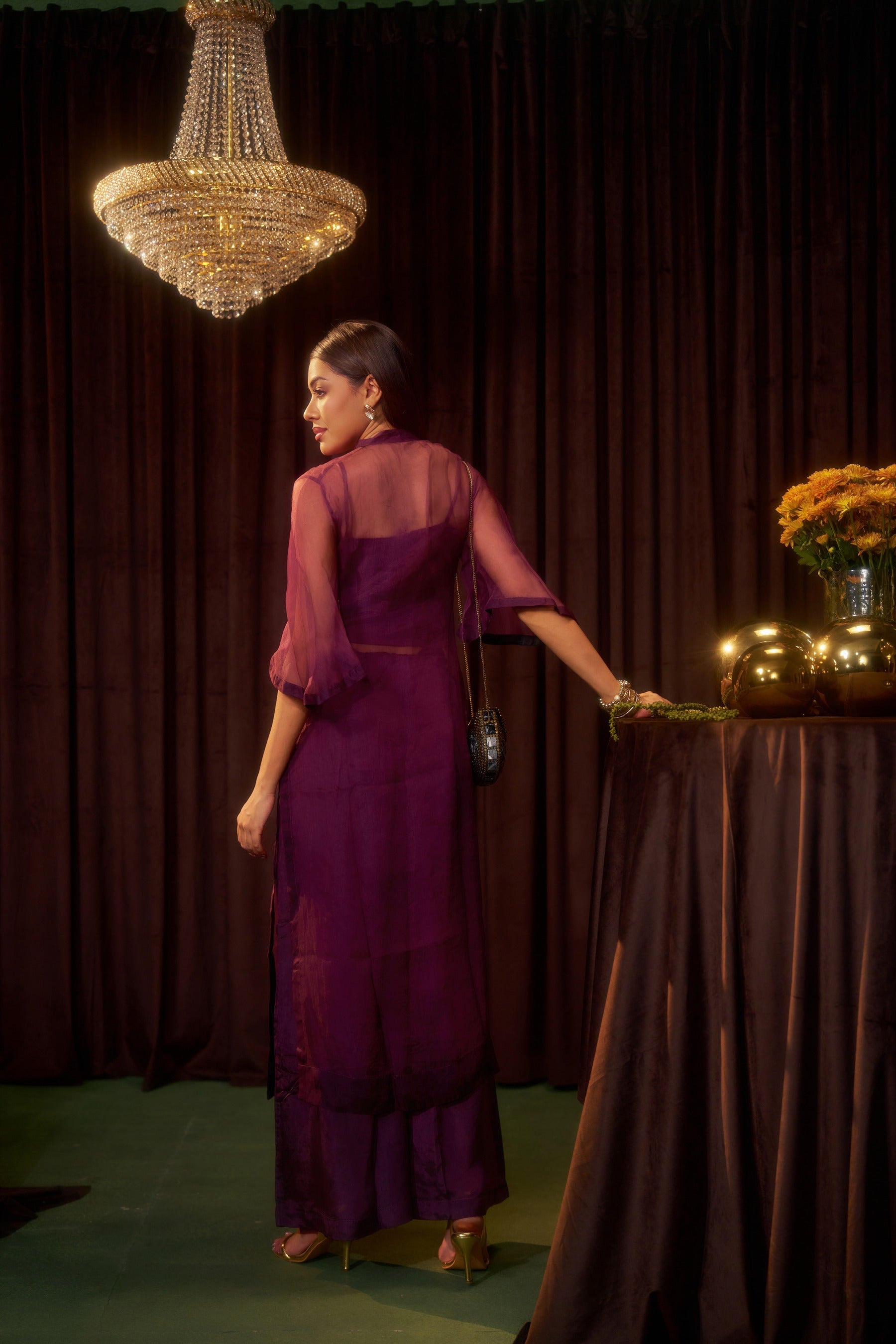 The Flore Sheer Mauve Set is made with an organza kurta and organza satin inner and pants. Its soft mauve shade and layered silhouette make it perfect for day-to-evening wear.