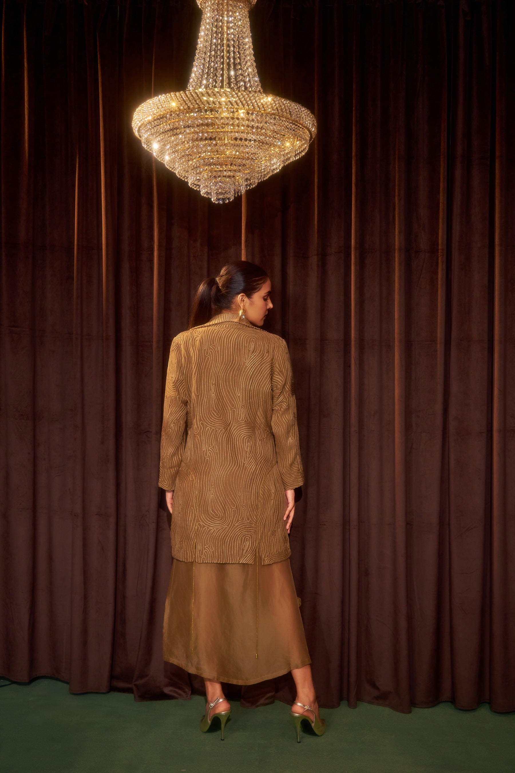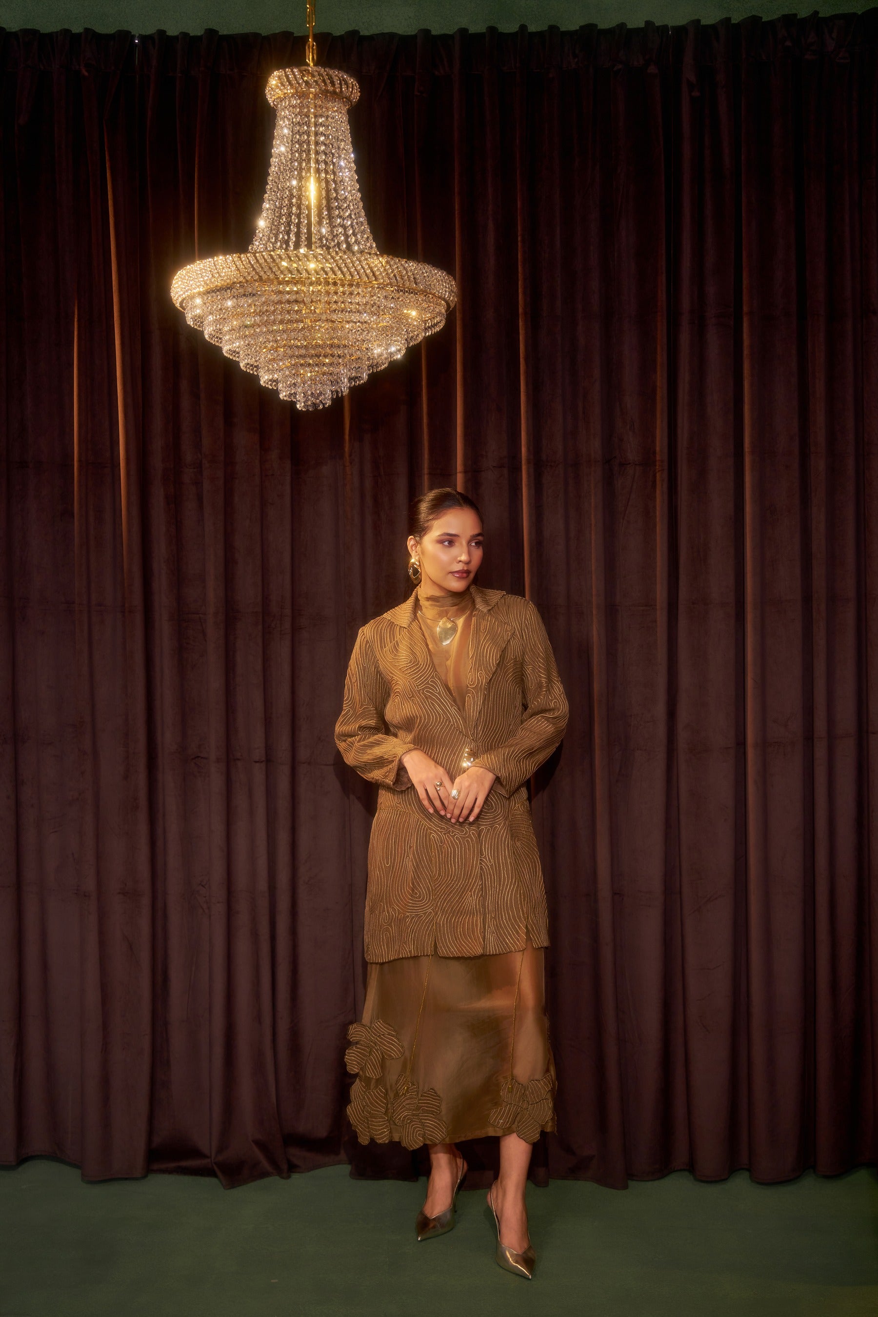 Made with corded embroidery on pure silk organza and an organza inner with applique flowers, the Gleia Gold Set combines texture with elegance. Its gold tone is ideal for weddings and festive evenings.
