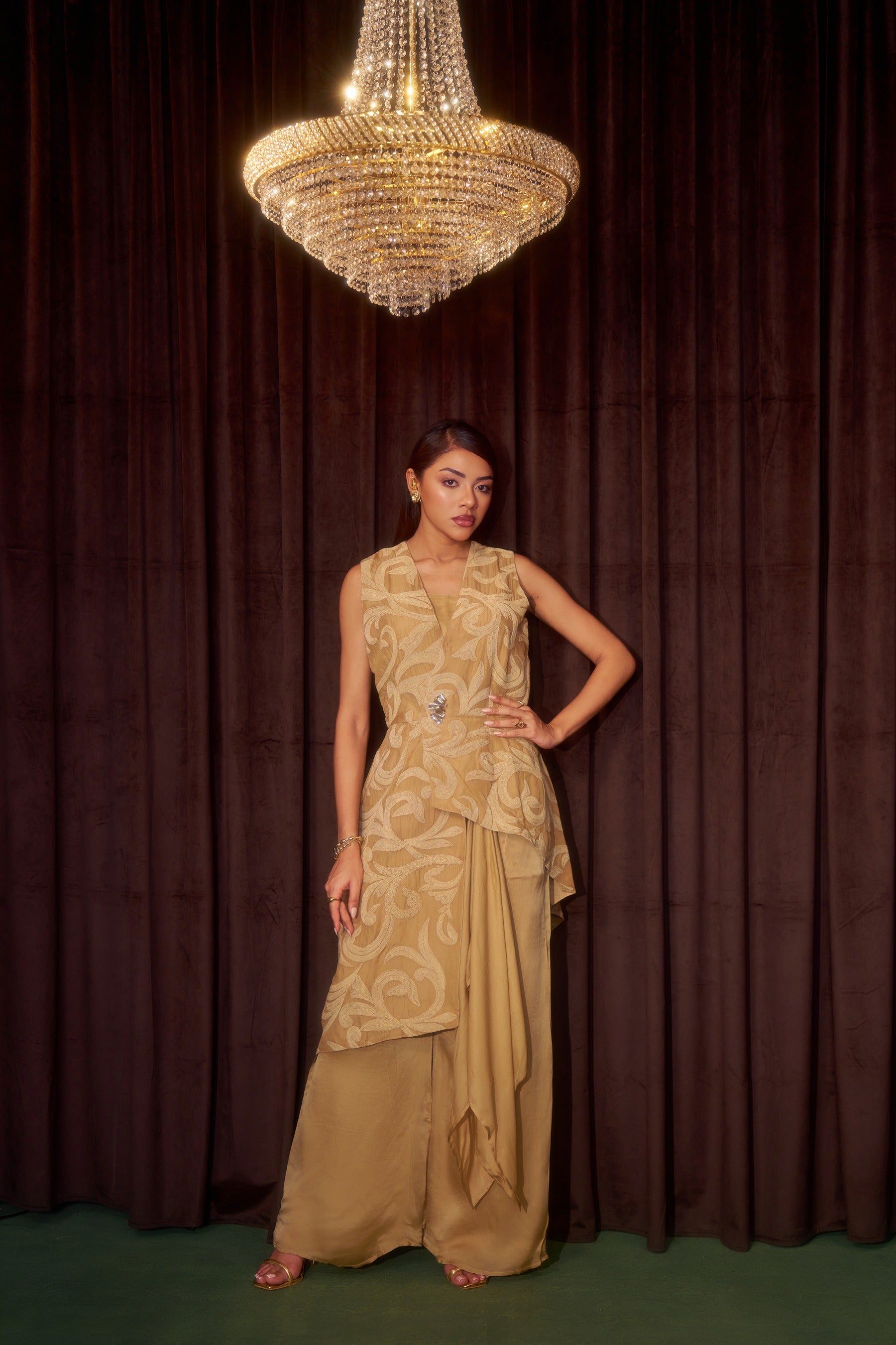 The Riva Gold Set is designed with corded embroidery on pure silk organza and a pure organza satin inner. Its soft drape and glowing finish make it a versatile festive piece.