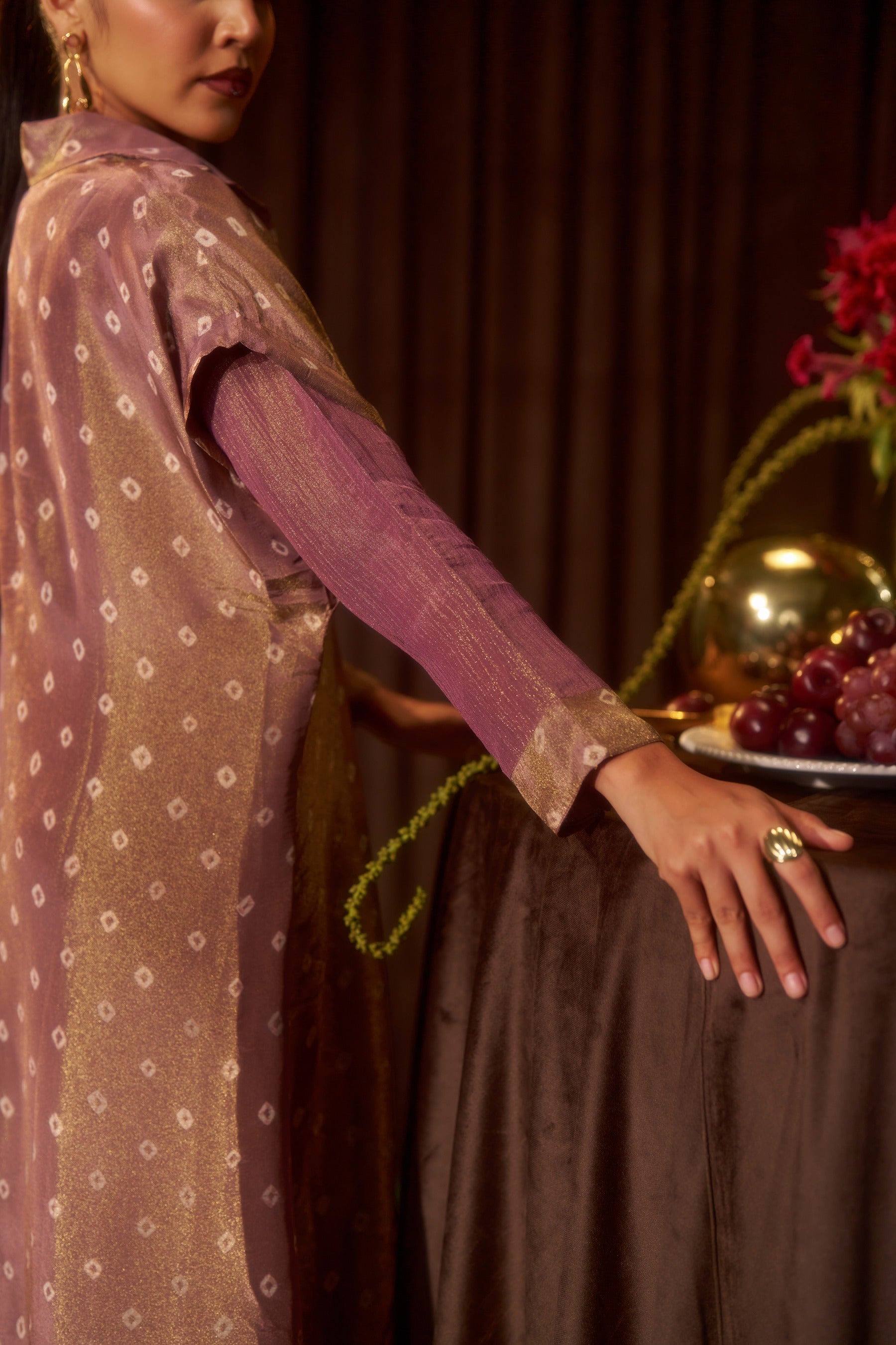 Crafted in bandhani on tissue with a wrinkled tissue inner, the Zarina Dusty Rose Set is soft and feminine. The muted rose shade and easy drape make it ideal for destination weddings, celebrations, or evening wear.