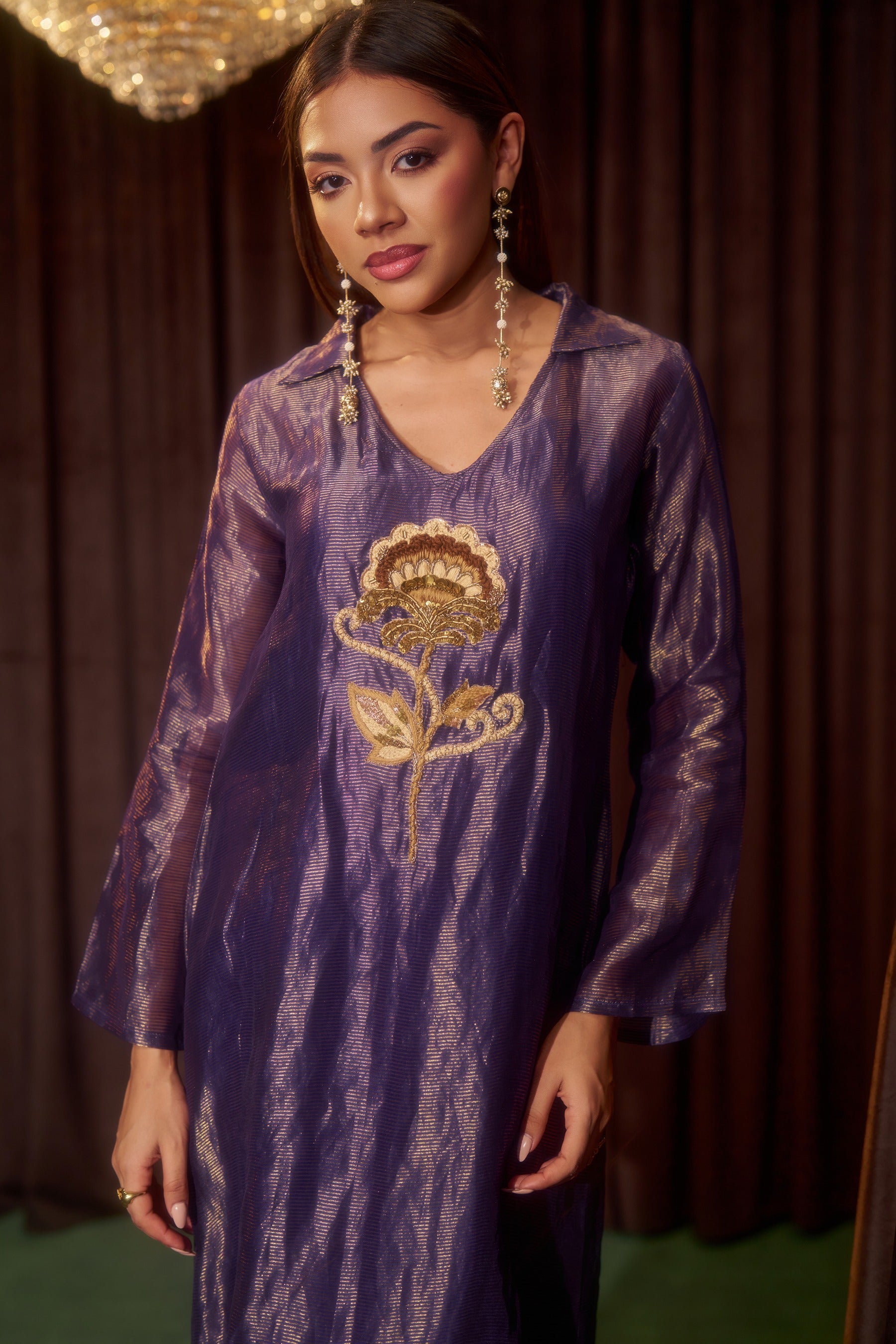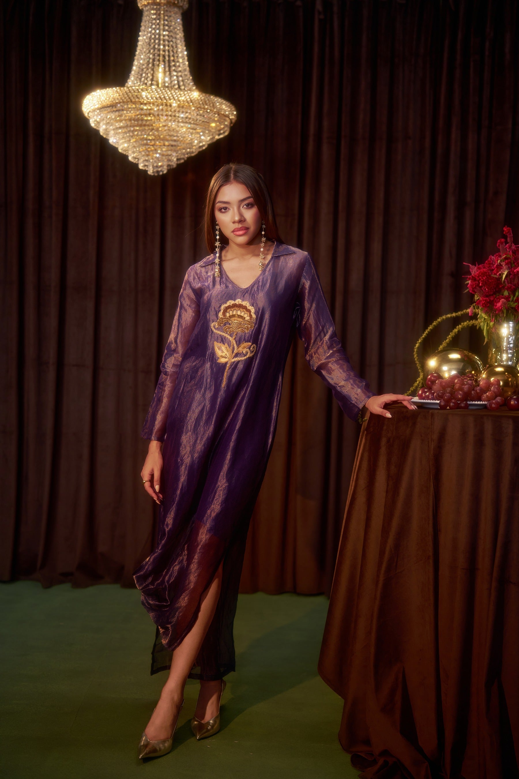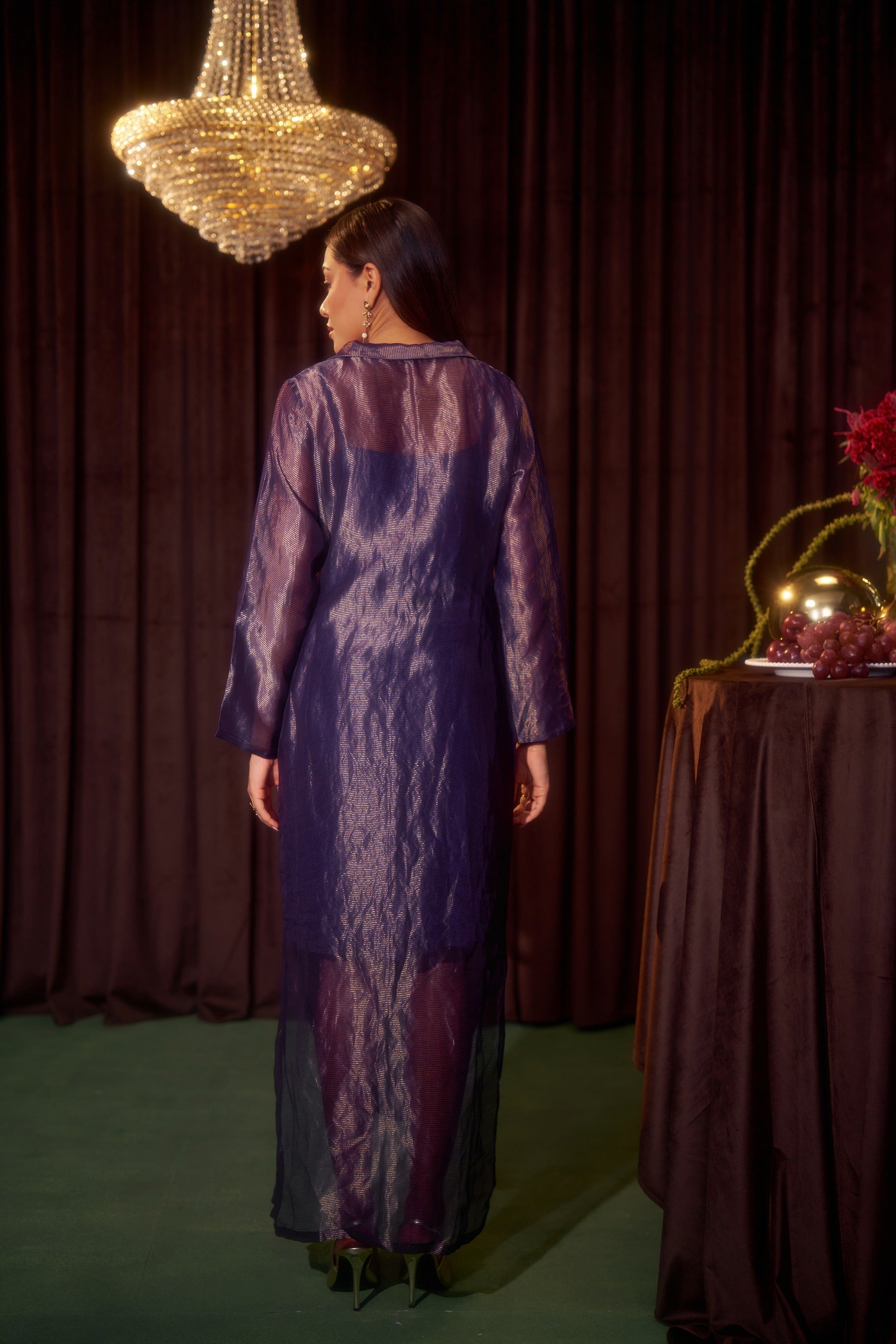 The Zova Tissue Set is crafted in pure silk tissue that drapes lightly and catches the light. Its simple silhouette works well for both festive gatherings and cocktail evenings.